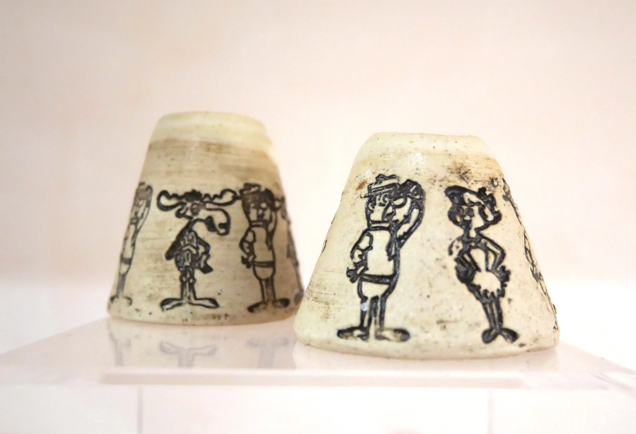 Gary Panter the cartoonist, visionary of the Pee-Wee’s Playhouse set and all around creative force did a stint at Mouse as a member. Here are two toothpick holders that I snagged after he left. Their tiny size and nostalgic cartoon stamps make these delightful little objects.